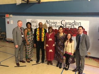 2019 February St. Richard Catholic School African Canadian Heritage Month Image 3 of 4 Director of Education, Rory McGuckin (far left), Principal Kevin Ng (far right), and Child and Youth Care Worker - Organizer (in Red) Francis Wint. Dr. Afua Copper and Lloyd McKell’s interview